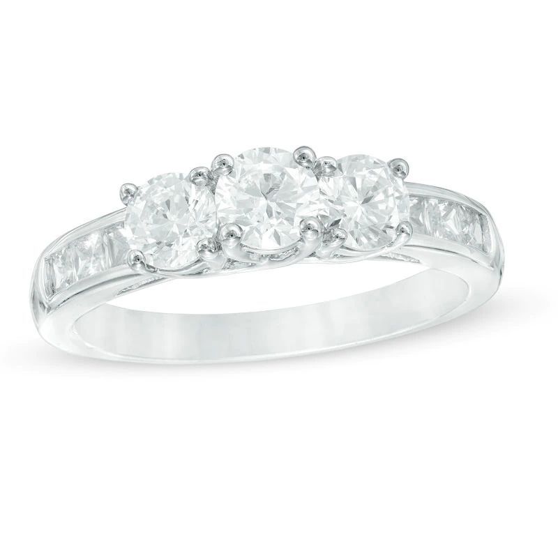 Simple and sophisticated, this three stone diamond engagement ring,beautifully expresses your loving commitment. Expertly crafted in 14K white gold, this ring features three shimmering round diamonds – the largest an impressive 3/8 ct. – set in perfect alignment across the center. Princess-cut accent diamonds are channel-set into the ring’s shank, completing this regal design. Engraved inside the 14K white gold band and set with two accent diamonds, remind her of your promise to be by her side, always. Radiant with 1-1/2 ct. t.w. of diamonds, this engagement ring is finished with a bright polished shine.This item is electroplated with rhodium or finished with an e-coating. These finishes may wear off with frequent use. Ask a jewelry consultant for details.