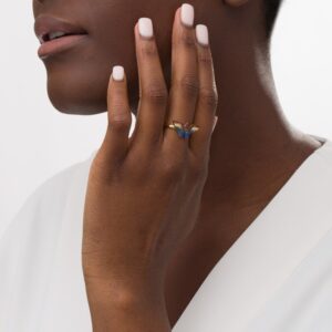 Crafted in warm 10K gold, this headpiece features a diamond border and pavé-detailed ribbon, carved into a subtle double “V” design. At the center of this split-prong setting is a petite diamond – strategically placed to enhance dimension and sparkle. With a 1/10 carat diamond and a brilliant polished shine, this ring is an accessory you’ll wear often.